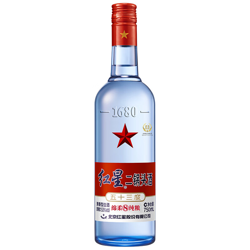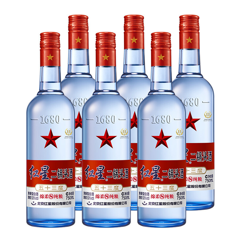 红星二锅头蓝瓶绵柔八陈酿纯粮 清香型白酒 53度 750ml*6瓶 整箱
