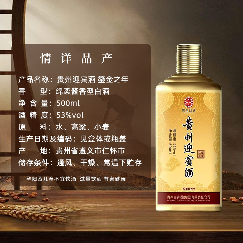贵州迎宾酒 鎏金之年 53度 绵柔酱香型白酒 收藏送礼自饮 500ml*6瓶 整箱装
